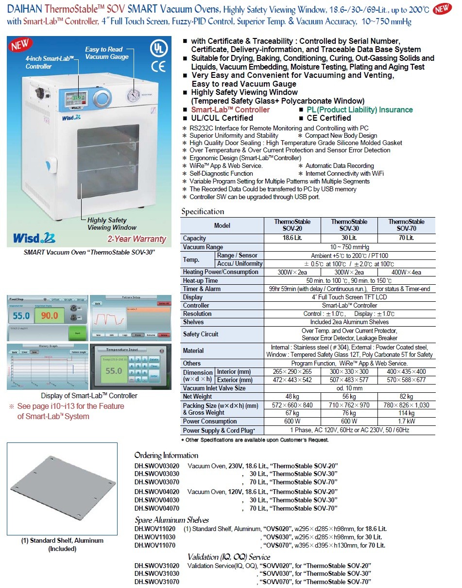 DAIHAN-brand® SMART Vacuum Ovens, “ThermoStable™ SOV”, Highly Safety Viewing Window, 18.6-/30-/70-Lit, 200℃with Smart-Lab™ Controller, 4″Full Touch Screen, Fuzzy-PID Control, Superior Temp. & Vacuum Accuracy, 10~750 mmHg스마트 진공 건조기/오븐, 고정밀 디지털 퍼지 제어, 알루미늄 선반 포함, Hi-Safety Viewing Window, with Certi. & Traceability